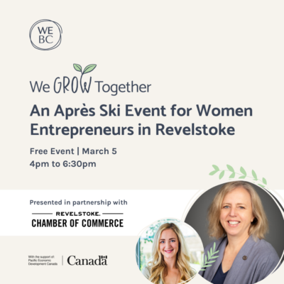 Join us on March 5 to connect with other current and aspiring women entrepreneurs and hear from some of the local organizations that provide financing and resources to small businesses, including WeBC and the Revelstoke Chamber of Commerce.