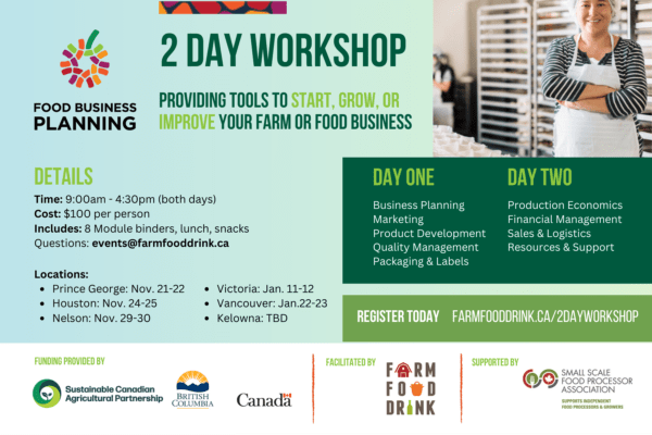 If you’re a BC-based food processor looking to improve or expand your business — or if you’re a farmer thinking about value-added products — don’t miss our two-day FoodBusiness Planning Workshop on January 11-12.