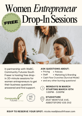 In partnership with WeBC, Community Futures South Fraser is hosting free drop-in 20-minute sessions for women entrepreneurs to get their business questions answered and find support.