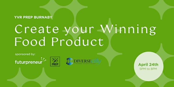 Join us for an engaging evening of inspiration and insight at the “Create Your Winning Food Product” event, proudly sponsored by YVR Prep, Futurpreneur, and Diversecity. Mark your calendars for Wednesday, April 24th, from 5-8pm, at YVR Prep in Burnaby.