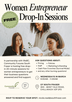 En partenariat avec WeBC, la Société d’aide au développement des collectivités de South Fraser organise des séances de 20 minutes pour permettre aux femmes entrepreneurs d’obtenir des réponses à leurs questions sur les affaires et de trouver du soutien.