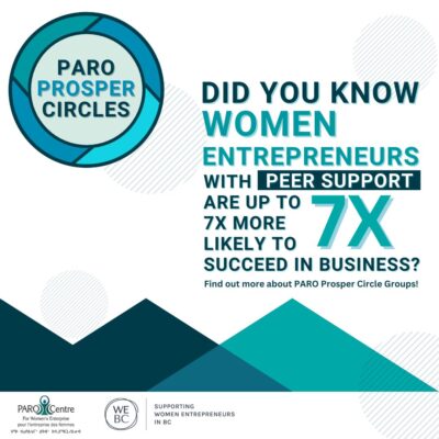 PARO is a not-for-profit organization that, like WeBC, has the remit to support women entrepreneurs throughout their entrepreneurial journey. One of the ways PARO does this is by helping women find or create their own peer support circles. These Circles allow women in BC (or across Canada) to come together and share knowledge, expertise, advice, etc. and also provide opportunities for small micro-financing loans. If you are interested in hearing more about PARO’s Prosper Circles Program, and other great free resources that PARO has to offer women entrepreneurs, please contact Deborah Lampitt- McConnachie at either deborah@we-bc.ca or prosperBC@paro.ca.