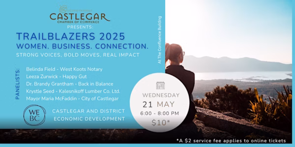 This event celebrates leadership, courage, and connection among women business owners and leaders in Castlegar and the RDCK Areas I & J. We are gathering local changemakers, especially those leading in traditionally male-dominated fields, to share stories, spark inspiration, and foster new relationships.
