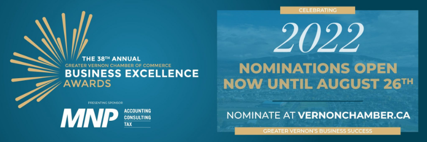 Nominate OnlineNominations are underway for the Greater Vernon Chamber of Commerce's 38th Annual Business Excellence Awards presented by MNP. Nominations run until Aug. 26 The online nomination form and descriptions of the 15 categories can be found here >>> The 15 individual categories are: Large Business of the Year sponsored by MNP Medium Business of the […]