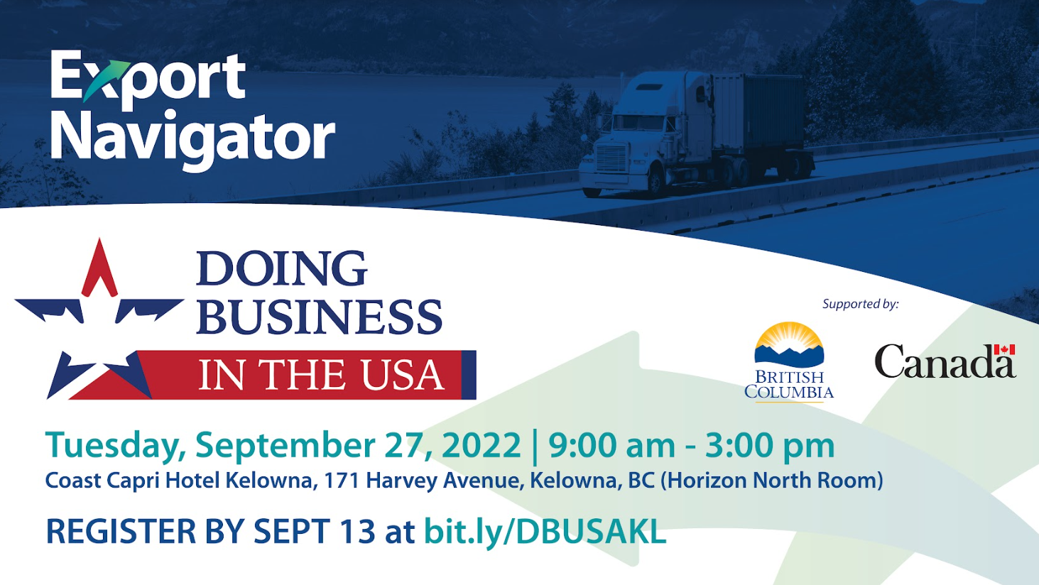Hôtel Coast Capri 171 Harvey Avenue (salle Horizon Nord),Kelowna,Colombie-Britannique,CanadaPrésenté par Export Navigator, Faire des affaires aux États-Unis (DBUSA) est un séminaire destiné à aider les propriétaires d'entreprises canadiennes à pénétrer le marché américain. L'un des principaux atouts commerciaux de Kelowna est sa proximité avec la frontière américaine. Cependant, le franchissement des frontières par des marchandises commerciales est confronté à des complexités et à […]