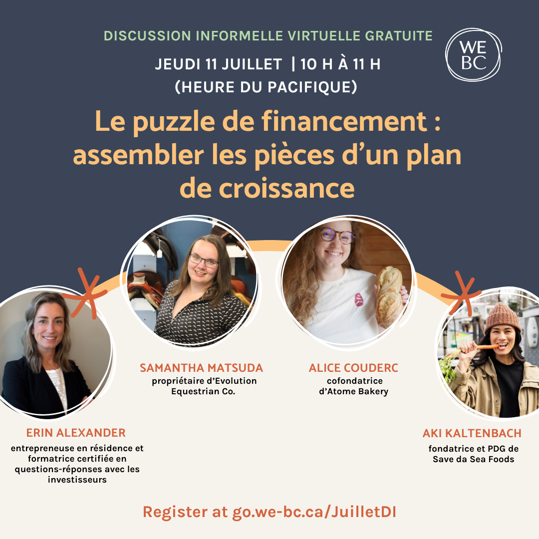 Le 11 juillet, nous organisons une discussion informelle avec quatre femmes fondatrices qui partageront leurs expériences en matière d’accès à diverses sources de capital pour stimuler la croissance de leur entreprise.
